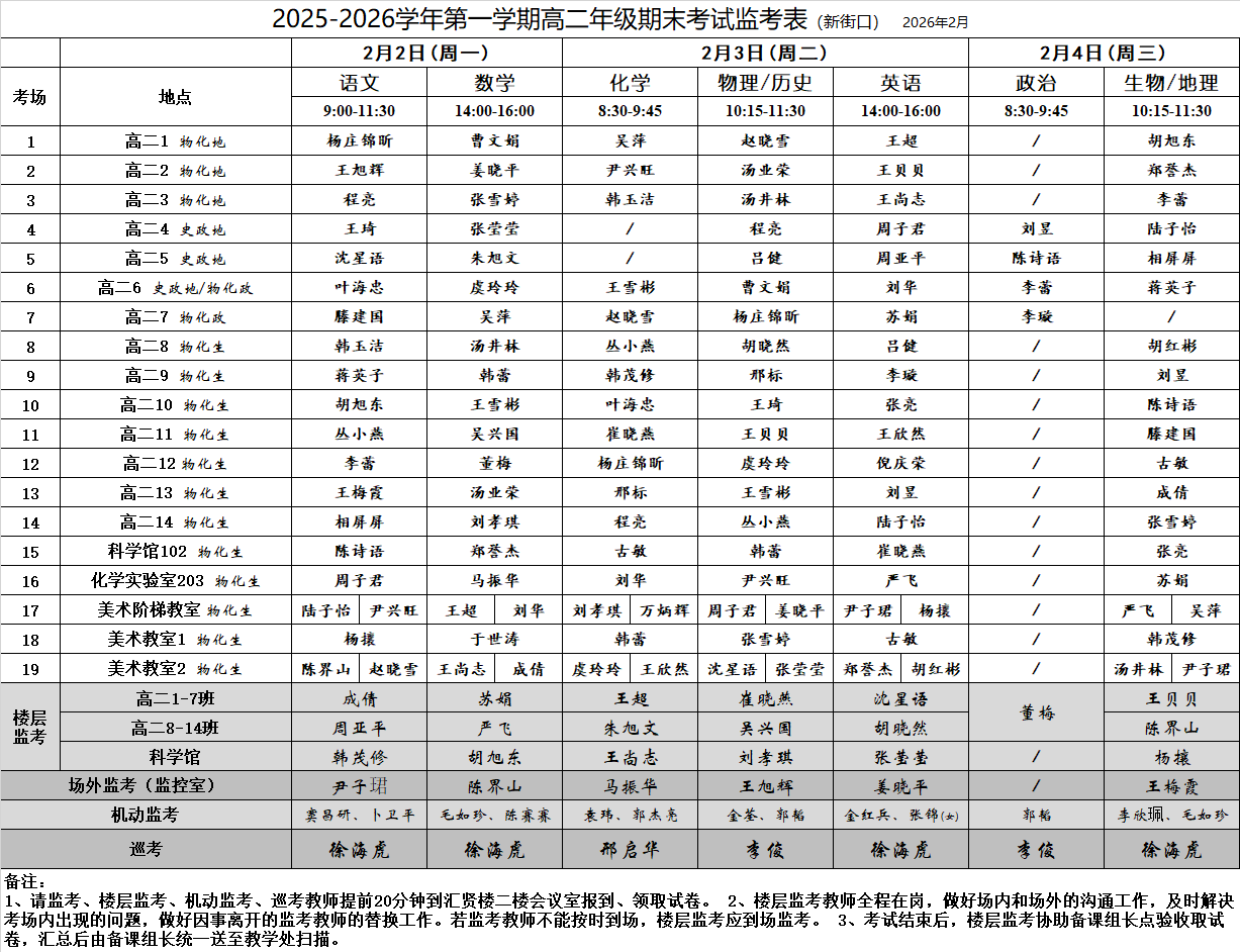 2025-2026学年第一学期高二年级期末考试监考表