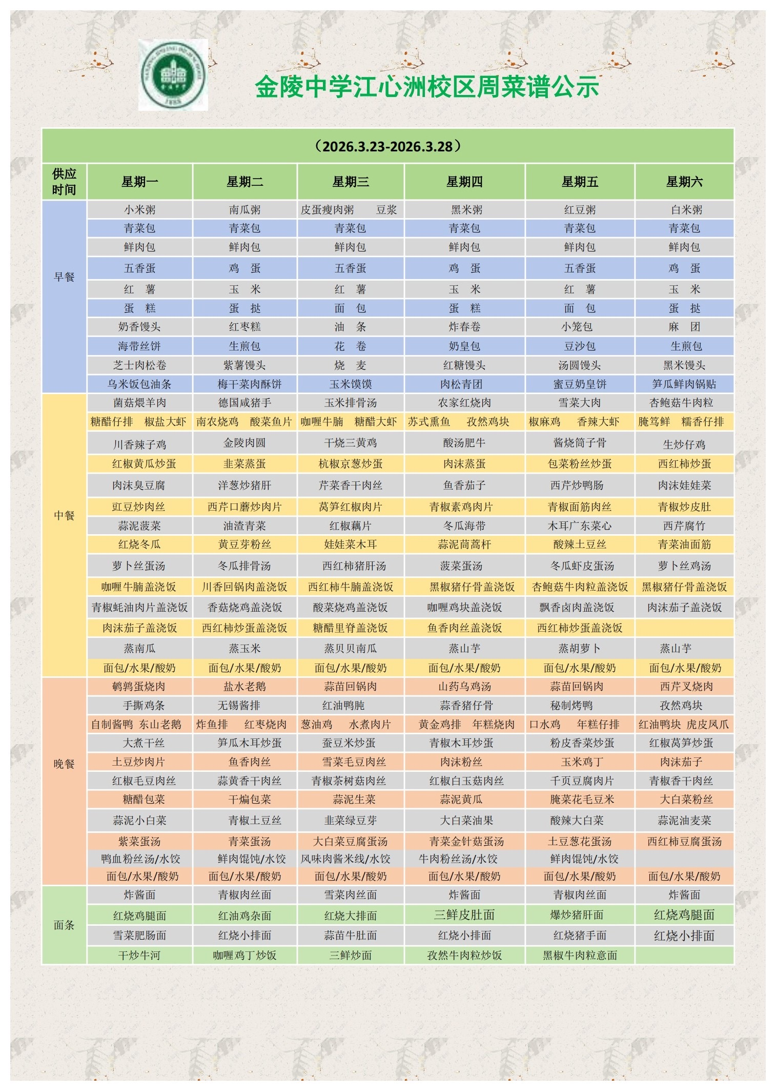 江心洲校区一周菜谱(2026.3.23—3.28)