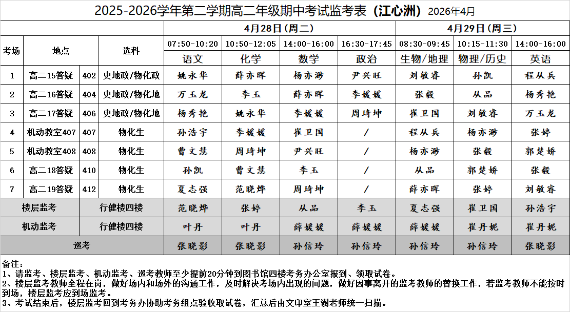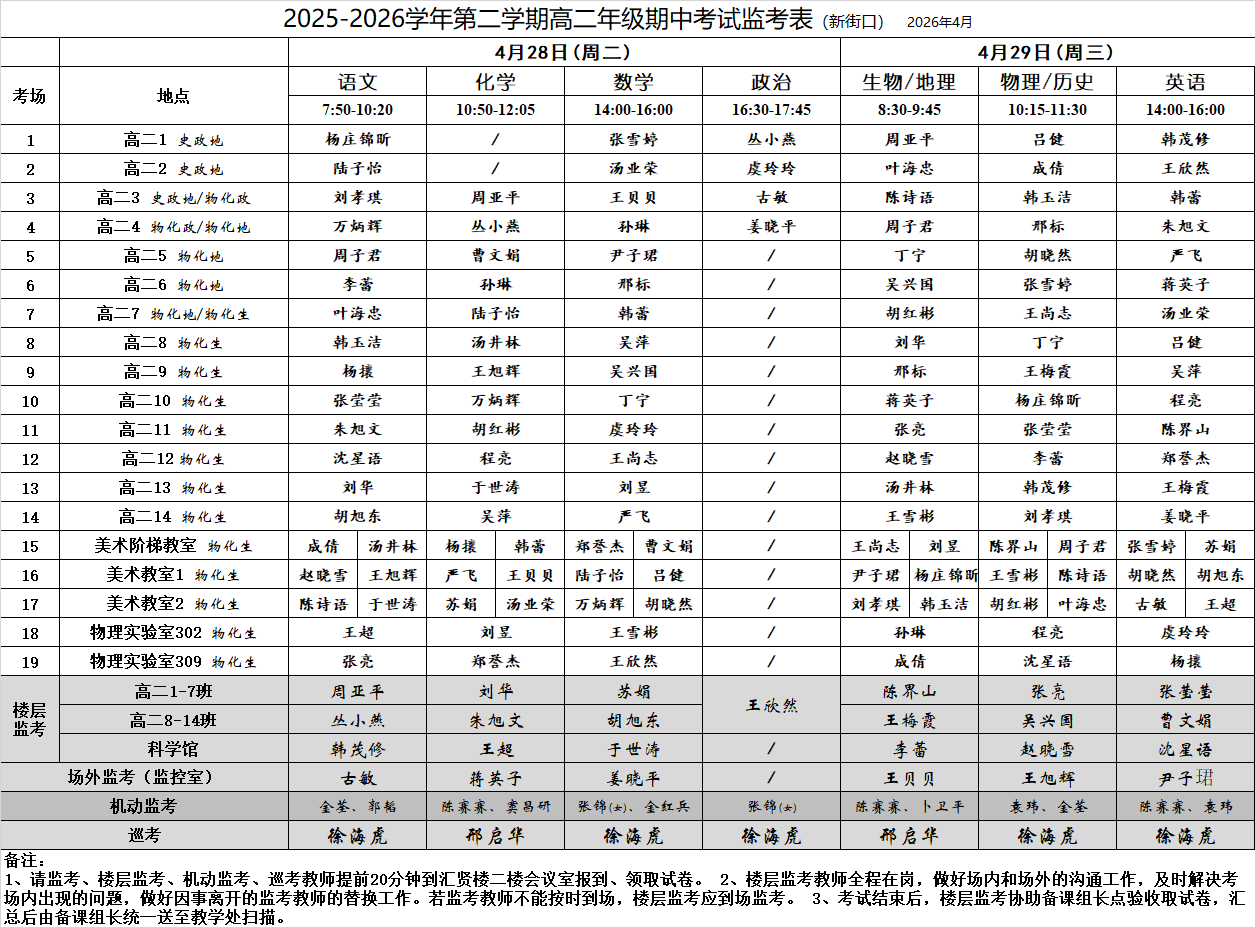 2025-2026学年第二学期高二年级期中考试监考表