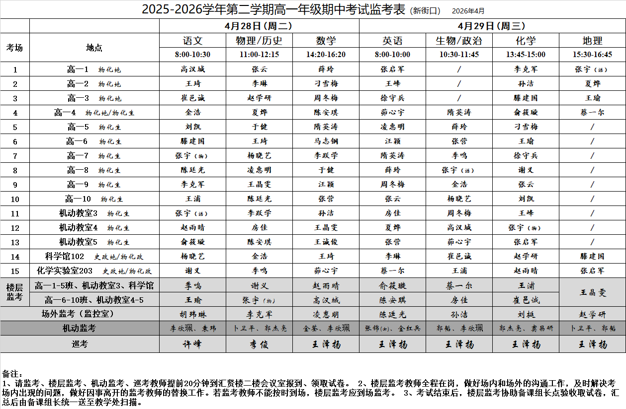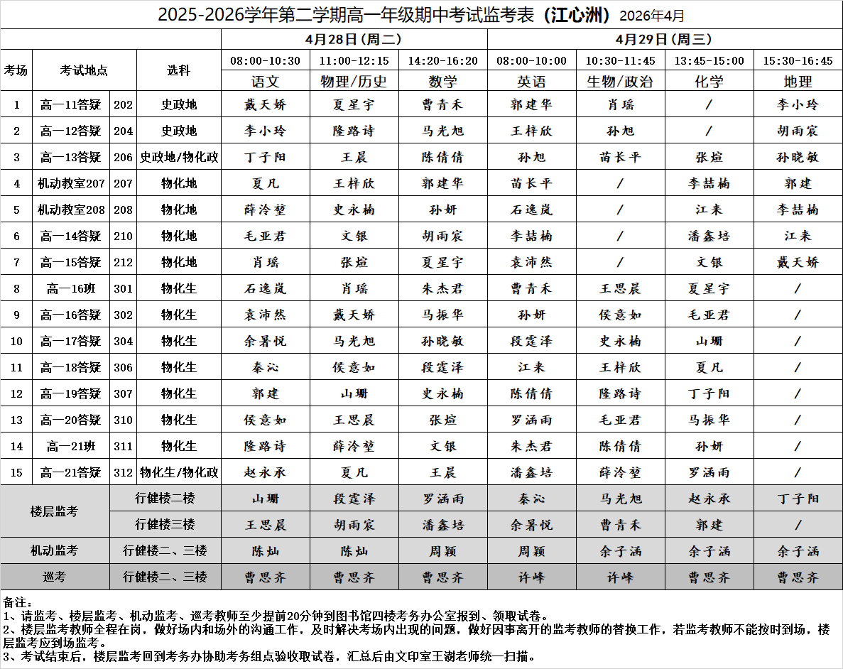 2025-2026学年第二学期高一年级期中考试监考表