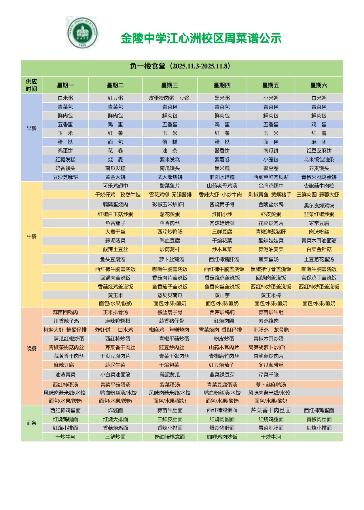 江心洲校区一周菜谱(2025.11.3—11.8)