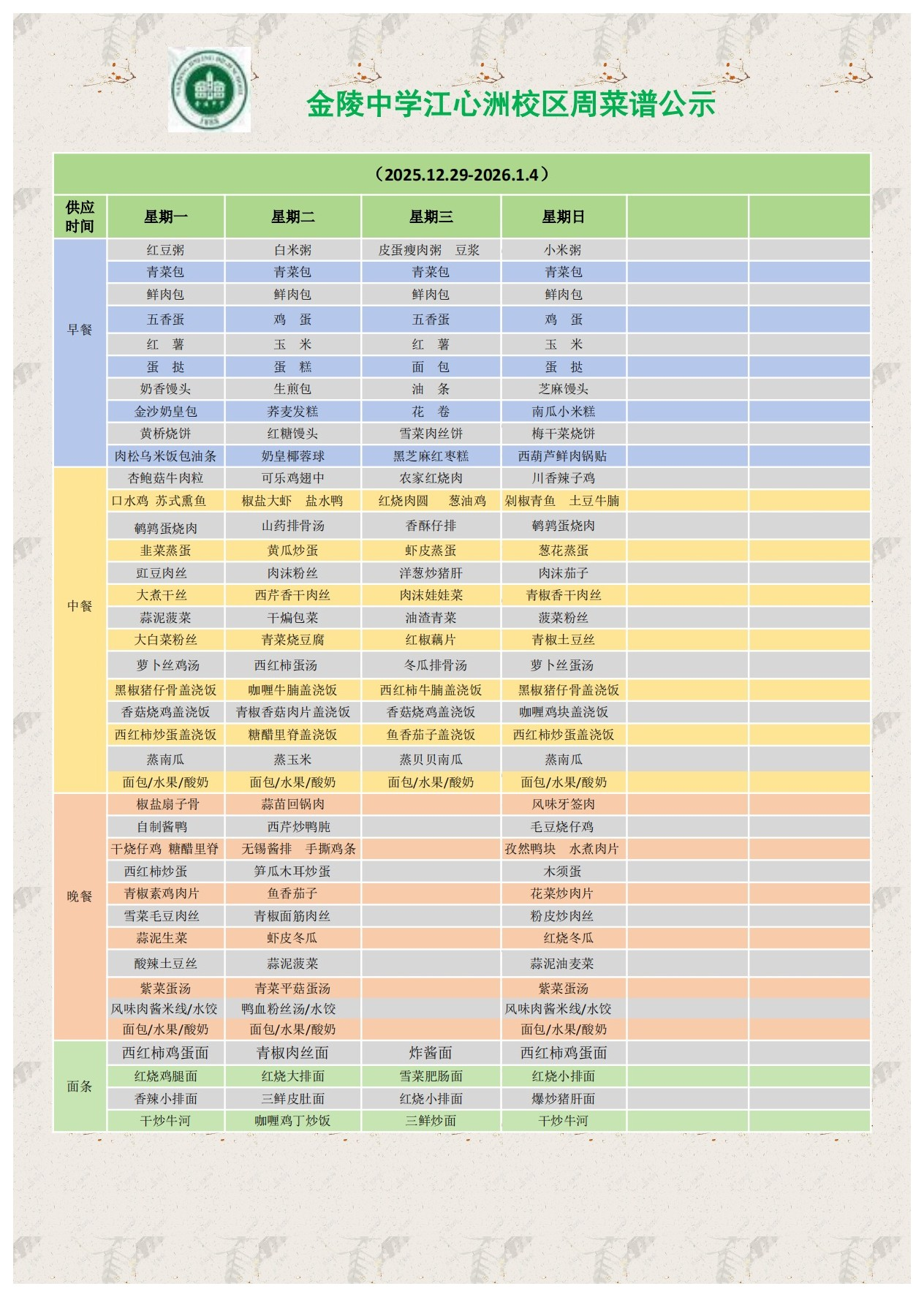 江心洲校区一周菜谱(2025.12.29—2026.1.4)