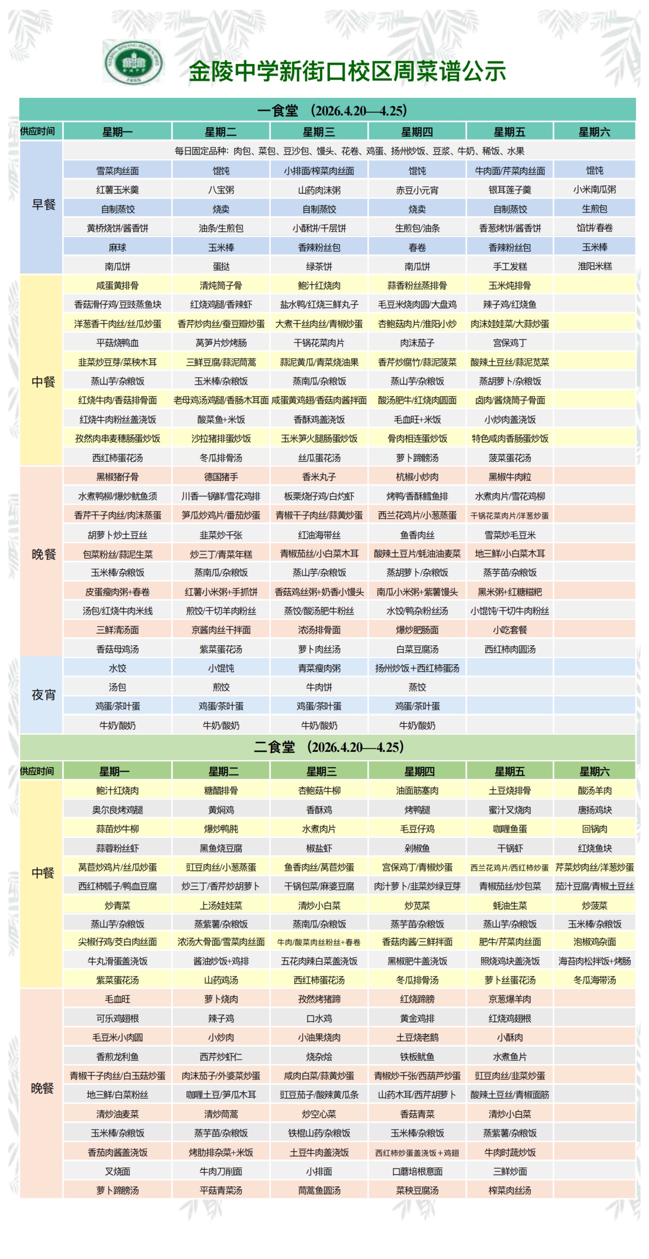 新街口校区一周菜谱(2026.4.20—4.25)