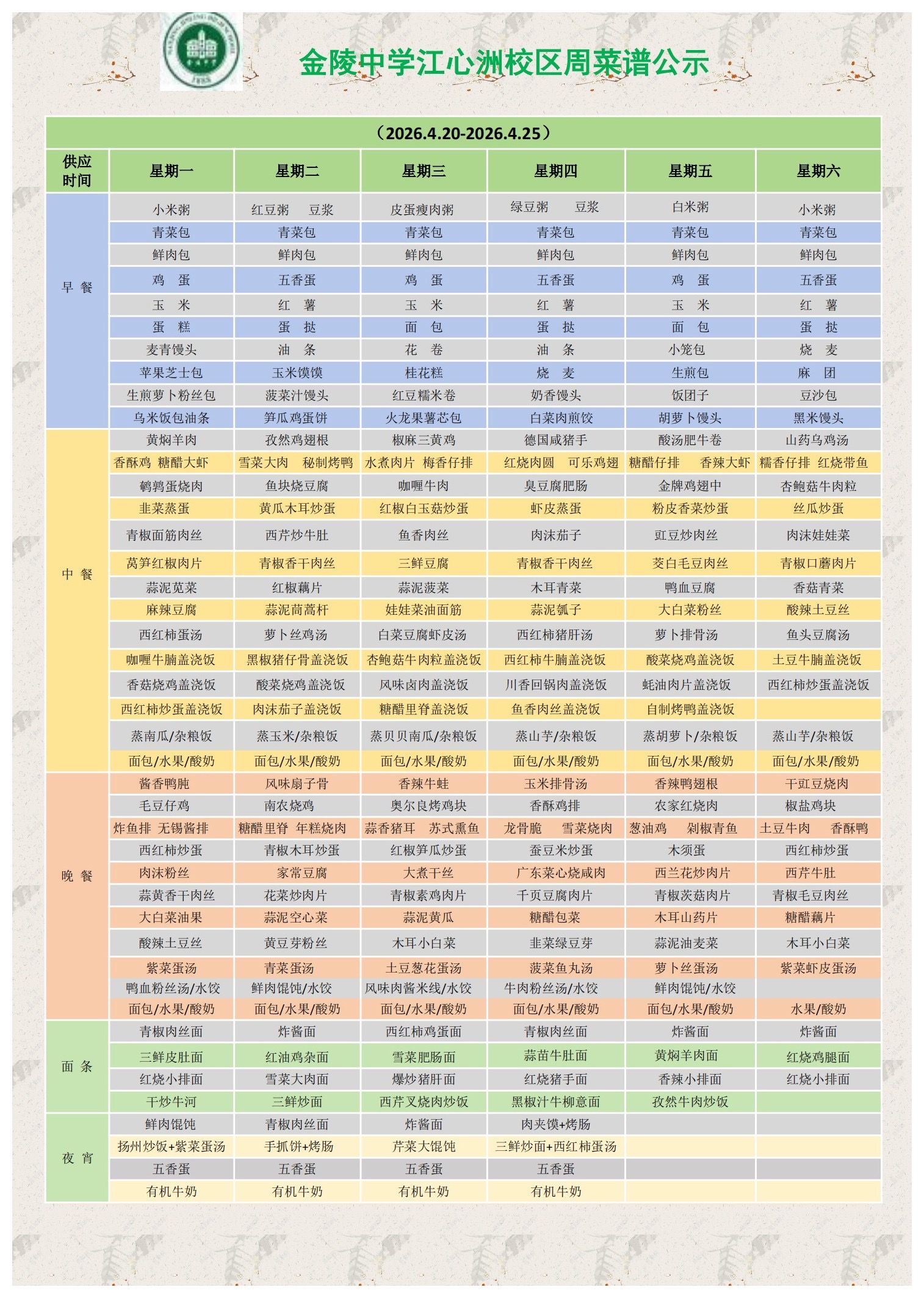 江心洲校区一周菜谱(2026.4.20—4.25)