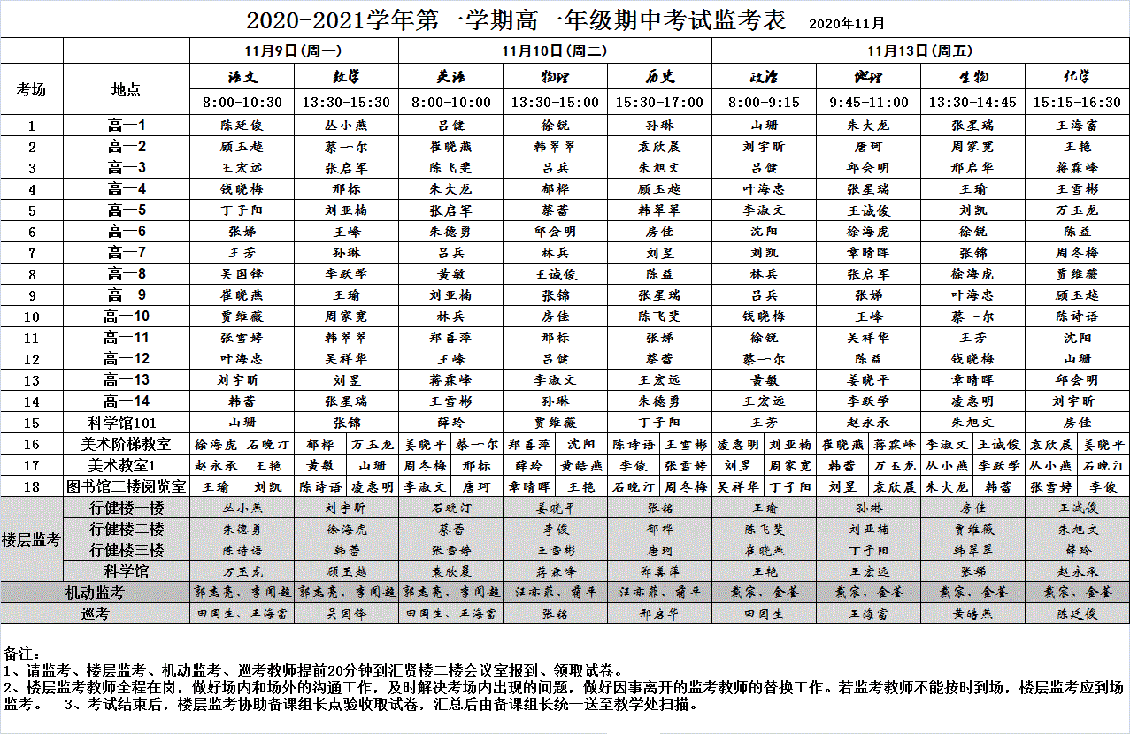 2020-2021学年第一学期高一年级期中考试监考表