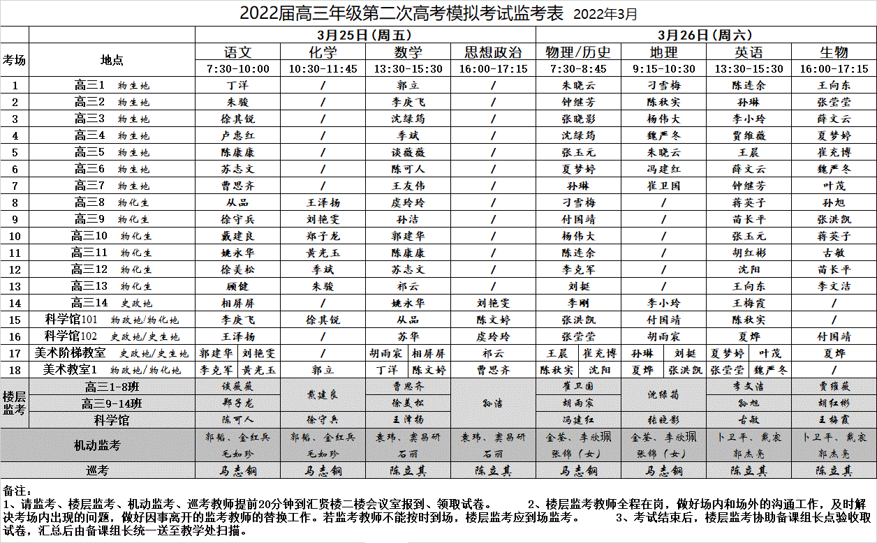 2022届高三年级第二次高考模拟考试监考表
