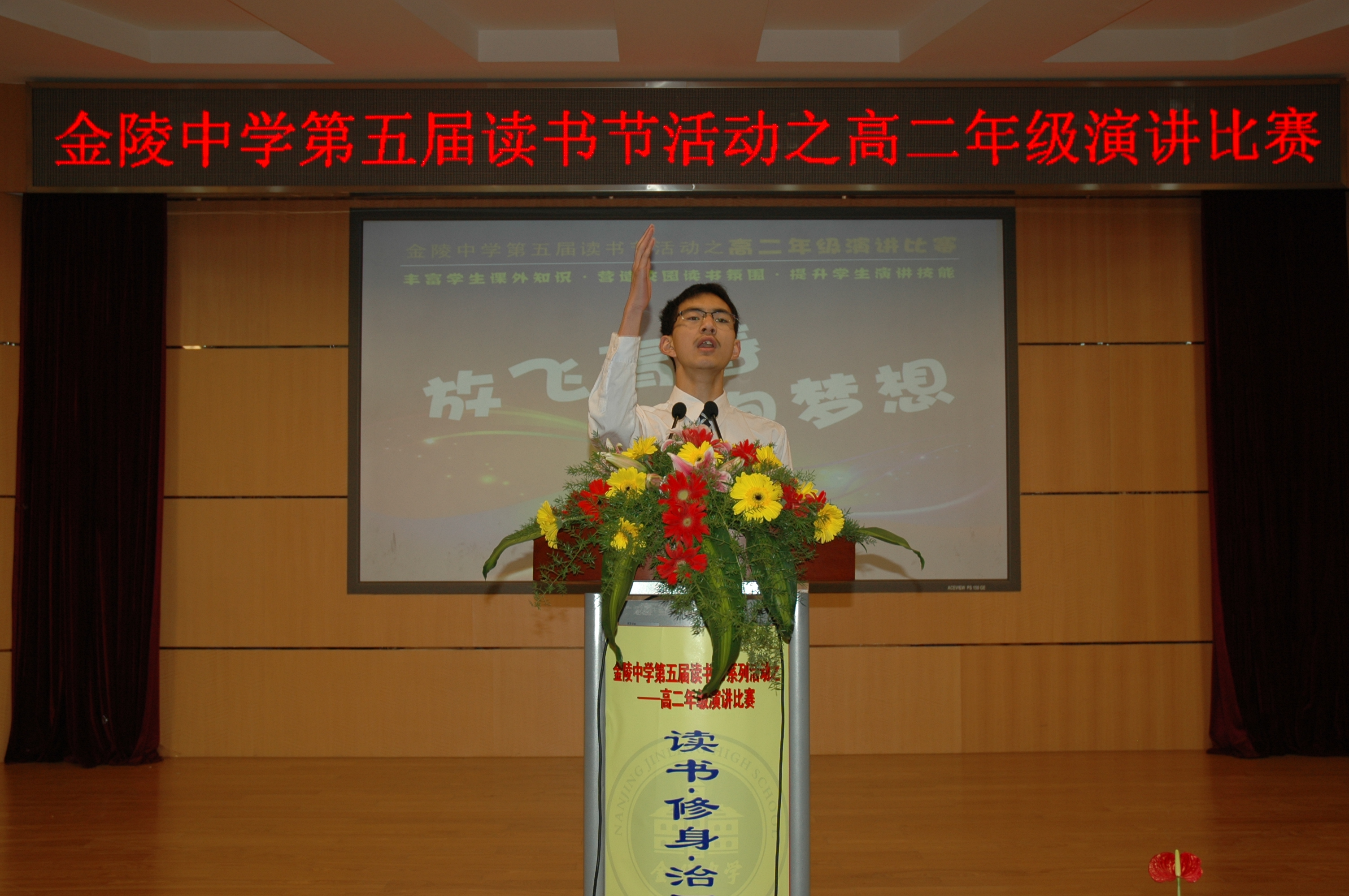 2011年6月2日下午,金陵中学第五届读书节系列活动之高二年级演讲比赛在科学馆报告厅举行。本次活动以“丰富学生课外知识,营造校园读书氛围,提升学生演讲技能”为宗旨;以“放飞青春、拥抱梦想”为主题。高二年级全体学生在各班进行初赛后每班选出一名选手进入决赛。