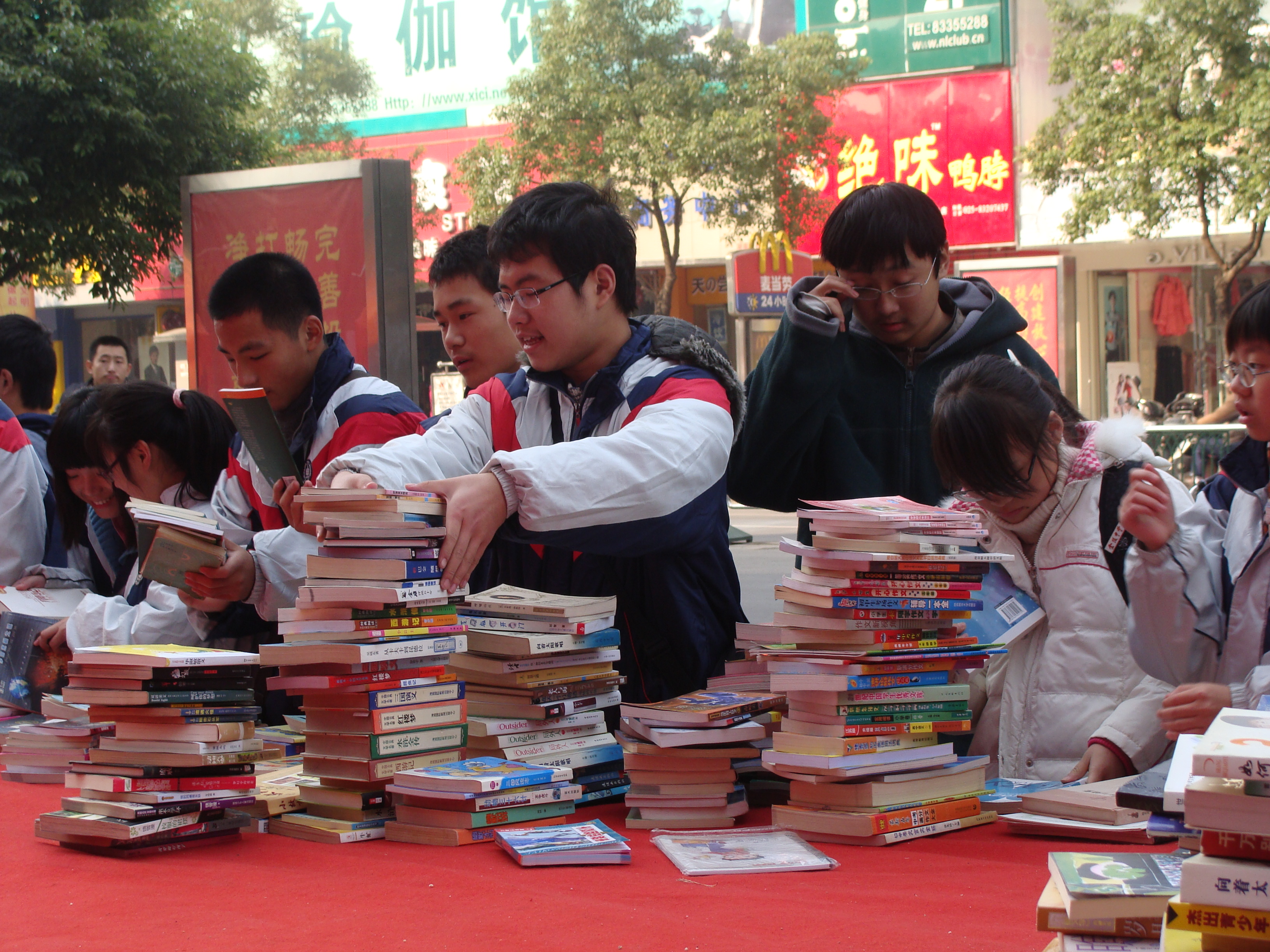 经过大概半个小时的前期准备工作,同学们已经高效率地将书籍整理分类和物品标价完毕, 展台上,舞台上物品排放的十分整齐醒目。细心的女同学承担记账,收钱的工作,活泼的男同学就揽下了宣传吆喝的活。不一会儿在大家热情的宣传下,就有诸多行人驻足买书。因为这次志愿者招募相应异常热烈,我校就有六七十名同学参加,所以部分没有分到工作的志愿者就主动要求拿着书去附近宣传吆喝,扩大影响面。这个方法果然很好,在同学们的热情推销下,不仅卖出了很多书,还吸引了更多人到活动中来。别看大家都是中学生,社会活动能力都非常出色,热情的向路人推销物品。本来家中不用的两本菜谱,在两个男生的宣传下,一位大妈欣然用原价买下。许多原本只是路过的行人,同学们向他们解说我们这次活动的目的后,也都慷慨解囊。
