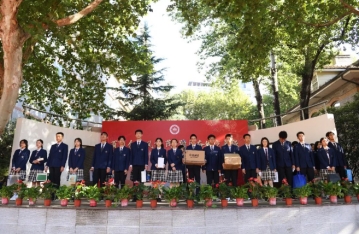 新街口校区开学典礼结束后,校领导一行带着高三学生送的礼物,集体来到江心洲,参加金陵中学江心洲校区首届开学典礼。