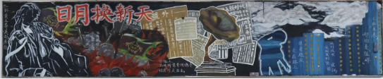 高一(16)班的黑板报以一条中国龙为主体,加入祥云,国旗等元素,以弹幕的形式表达了同学们对祖国最真挚的祝福。同学们利用课余时间悉心设计,构思板报结构;上网查阅,编写文字内容,用心对待黑板报这一班级文化,体现出同学们善于想象,勇于创新,敢于