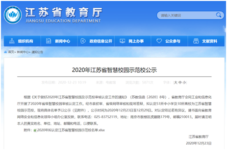 根据江苏省教育厅、工业和信息化厅《关于做好2020年江苏省智慧校园及示范校审核认定工作的通知》(苏教函〔2020〕8号),省教育厅开展了江苏省智慧校园审核认定工作。我校积极参选审核认定,经过层级选拔,2020年12
