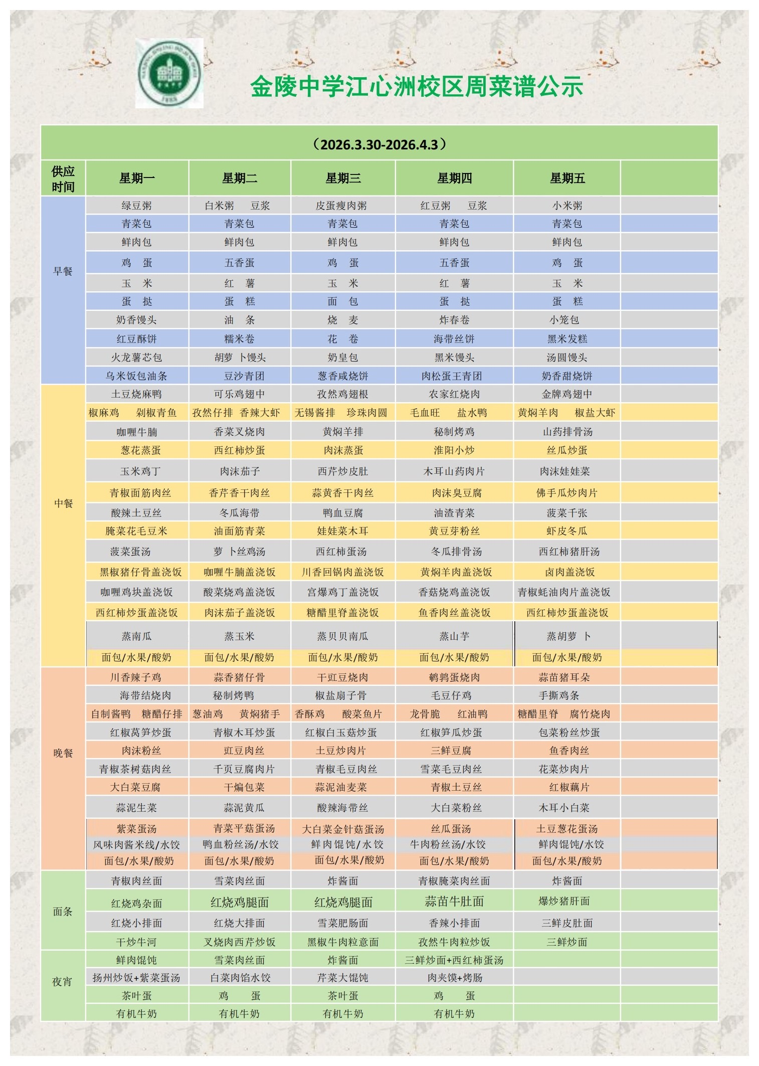 江心洲校区一周菜谱(2026.3.30—4.3)