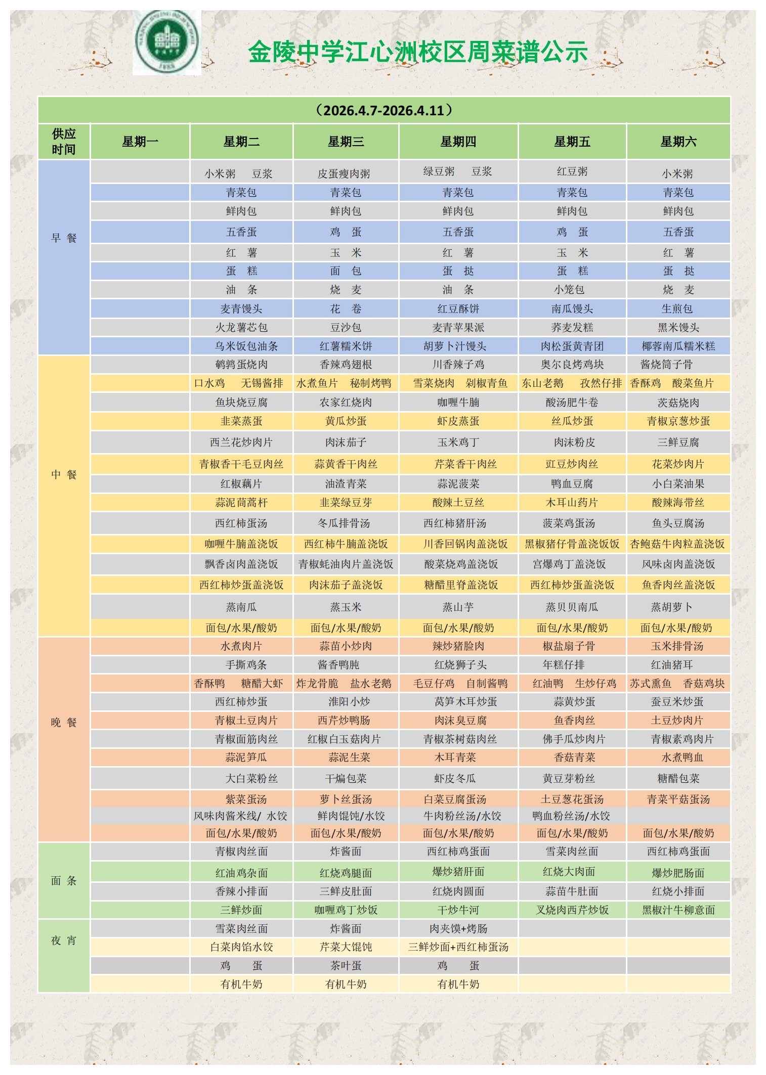 江心洲校区一周菜谱(2026.4.7—4.11)
