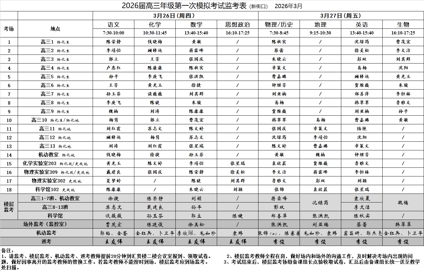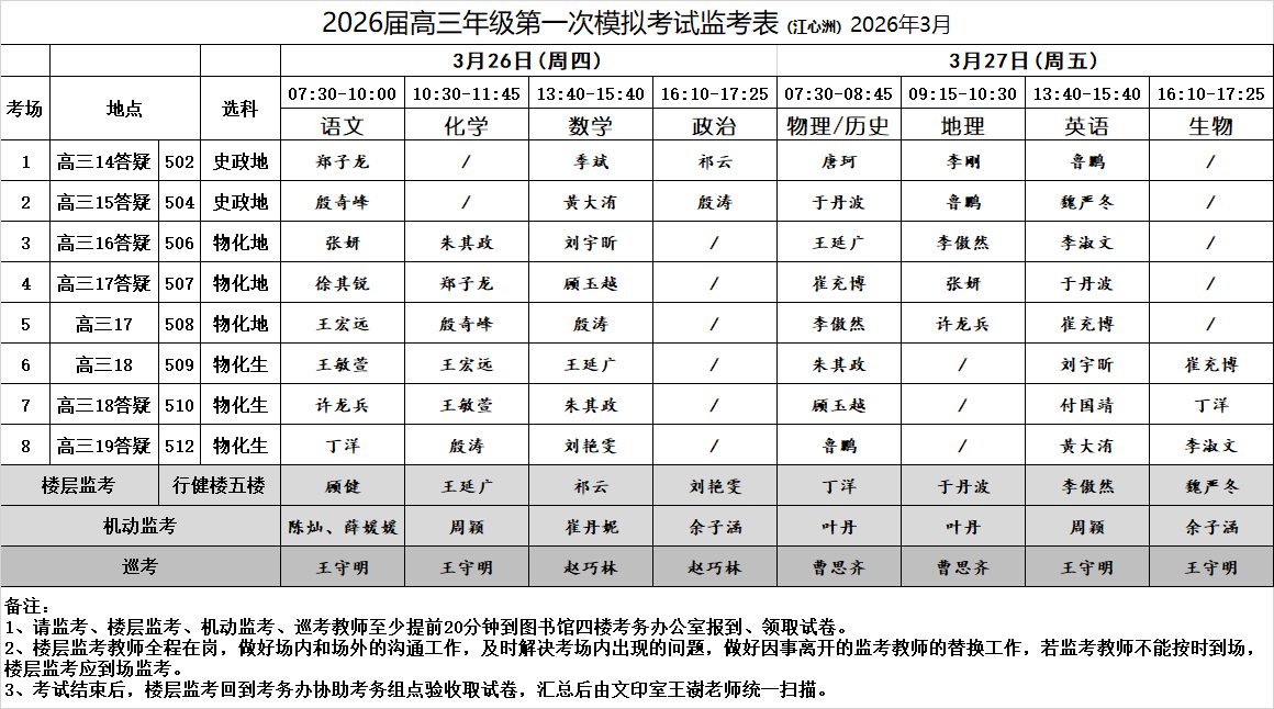 2026届高三年级第一次模拟考试监考表