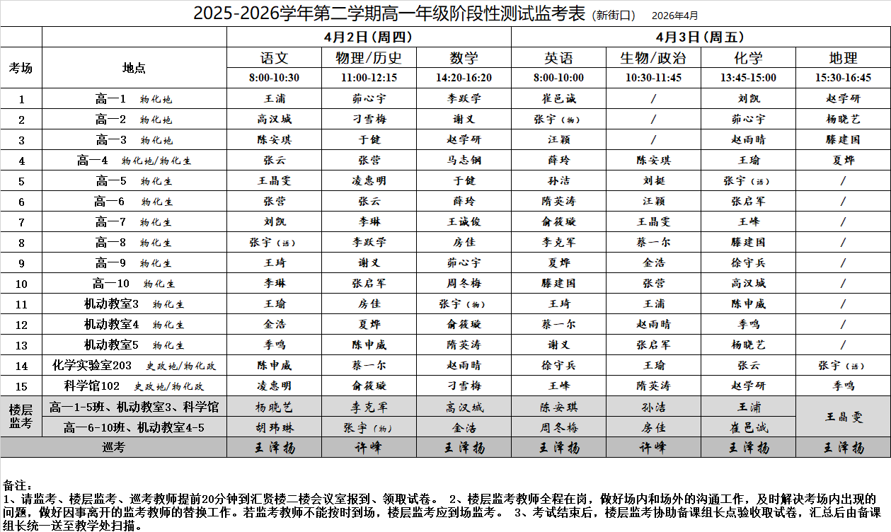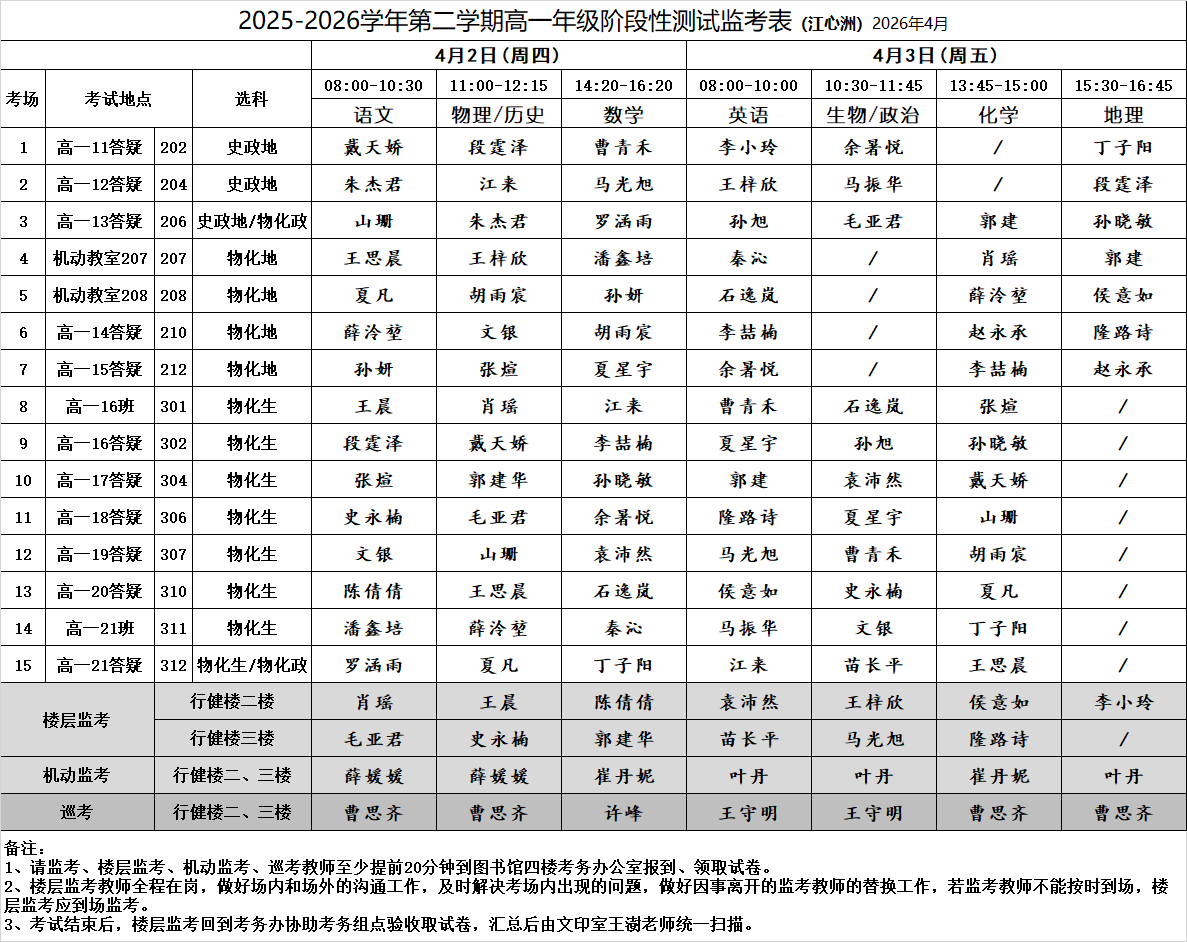2025-2026学年第二学期高一年级阶段性测试监考表